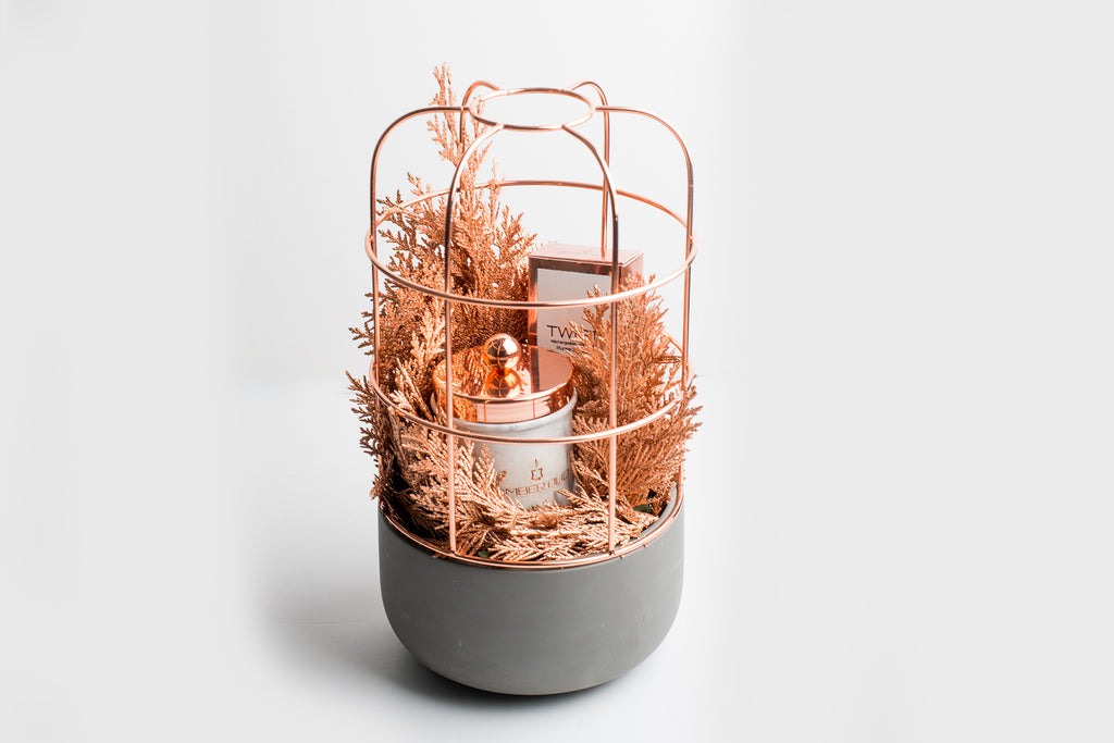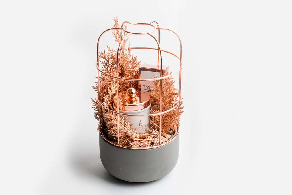 جره انيقة متعددة الاستخدامات مصنوعه من الجص الابيض مع تمويجات يدويه بلون رمادي و غطاء معدني نحاسي