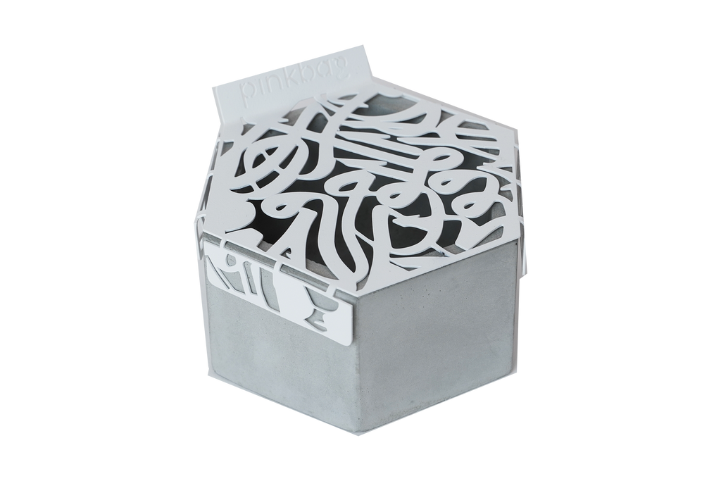 A handmade concrete mubkhar along with a white steel calligraphy base.